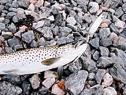 Sluker Sluker finnes i alle mulige størrelser og fantasifulle former, og jeg tror jeg har prøvd alt på markedet her i Bergen, og 2-3 stykker skiller seg ut. Møresilds variasjoner over sild er noen av de bedre. Spesielt deres nye hvite og grønne10 grams sild har blitt en vinner hos meg. Sammen med disse er der et utvalg av Aktiv Fritids SeaTrout sluker. Disse er utviklet for å etterligne noen av de mange byttefiskene sjøørret jakter på. Å velge riktig type er enkelt, jeg velger lyse sluker i dårlig vær, hvite for rolig vær. Om natten er det kun sort som virker. Det har ingen hensikt å ha mer enn 3 farger. Jeg har fått masse ørret med kun tre forskjellige mønsttre. Vi drar rundt på slukskrin full av unødvendige og uønskede sluker.
